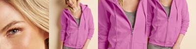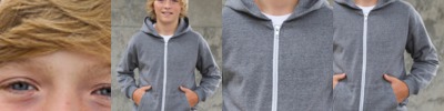 Air jet yarn; softer feel and no pilling. Unlined hood with colour-matched flat drawstring. YKK metal zipper. Overlapped fabric across zipper allows full chest printing. Pouch pockets. Three needle topstitched hood, pocket opening and waistband. 1x1 athletic rib with spandex. Quarter-turned to eliminate centre cease.