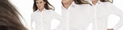 Open neck. Fused collar. Semi fitted. Front and back darts. Back yoke. Rounded hem. Turn back cuff. Spare button. Easy iron fabric. Size 8 10 12 14 16 18 20