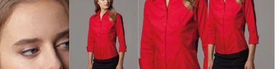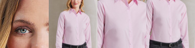 Blended polyester/cotton Easy Care poplin fabric providing comfort and durability. Soft fused feminine collar. Angle cut 2 button adjustable cuffs with additional cufflinks buttonhole. Squared cuff gauntlets. Darts at bustline, front and back panels for adjusted fit. Cross stitched matching mother of pearl effect buttons. Horizontal last buttonhole. Modern rounded bottom hem. 1 Spare button.