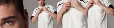 Taped neckline. 3 button fused placket, selfcoloured buttons. Reinforced shoulder seams with single needle stitching. Ribbed flat-knit collar and cuffs.