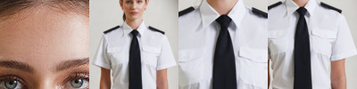 Women's short sleeve easy care pilot shirt. Stiffened collar. 2 chest pockets with button flaps. Combined pen pocket on left breast pocket. Short sleeves. Epaulettes on shoulders. Easy care – soil resist finish. Size 8, 10, 12, 14, 16, 18, 20, 22, 24, 26