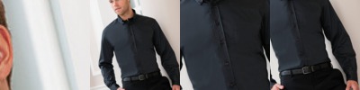 Twin-needle stitched around armholes, cuffs and across shoulder seams. Taped back neck, half moon yoke. Comfort finish cuff seams. Taped reinforced shoulder seams. Half moon yoke. Slanted placket. Also available in kids'