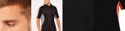 Dual colour Short Sleeve Polo Shirt. Flat knit collar with taped neck. 3 button placket. Contrast panels down arm and body sides. Hemmed sleeves. Side vents. Twin needle finishing.